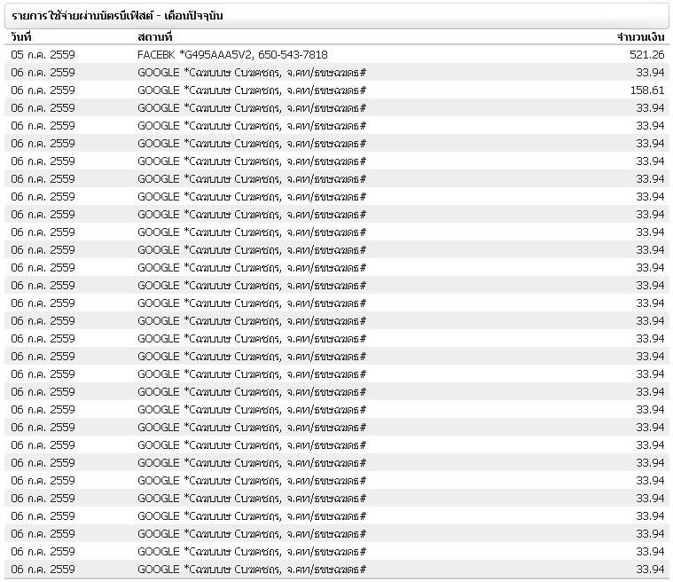 เท้าความก่อนนะครับ เมื่อ 2 ปีก่อน ผมเคยแอดบัตรเครดิตเข้าไปใน google เพื่อใช้ Adwords หลังจากนั้นผมได้มีการเปลี่ยนบัตรเครดิต โดยเลขบัตรเดิมที่เคยใส่ใน google นั้นถูกยกเลิกแต่เนื่องจากผมมีค่าโฆษณา Adwords ค้าง google อยู่ 3 พันกว่าบาท google ไม่สามารถหักผ่านบัตรได้ และผมก็ไม่ได้แอดเลขบัตรใหม่เข้าไป ตั้งแต่นั้นจบก่อนหน้านี้ google ไม่เคยหักเงินผมเลยมีแต่เมลล์แจ้งเตือนว่ายังมียอดค้างชำระอยู่ ผมก็ไม่ได้คิดอะไร กะว่าเด๋วมีตังค์ก็จะจ่ายไปเพราะต้องใช้ทำโฆษณาเว็ปอยู่แล้ว แต่ปัญหามาเกิดขึ้นเมื่อเช้า ธนาคารส่ง sms แจ้งยอดเงินคงเหลือในบัญชีผมเข้ามา เหลือไม่กี่ร้อยบาท ตกใจมาก เช็คในเว็ปธนาคารดูความเคลื่อนไหว สรุปตามภาพครับ google เอาไป แล้วผมก็เข้าไปเช็คในยอดค้างจ่ายของ google ก็ไม่ได้ถูกหักลงไปเลยสักบาท แต่หักเงินผมไปเป็นพัน