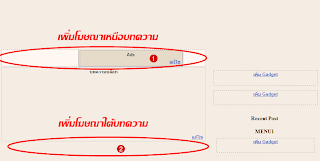 เพิ่มโฆษณาเหนือบทความ หรีอใต้บทความตามภาพเลยครับ โฆษณาจะแสดงเฉพาะที่หน้าบทความภายในเท่านั้น ส่วนหน้าแรกของบล็อกโฆษณาจะไม่แสดงครับ หากจะเพิ่มตรงส่วนอื่นก็คลิ๊กแล้วลากเลยครับ