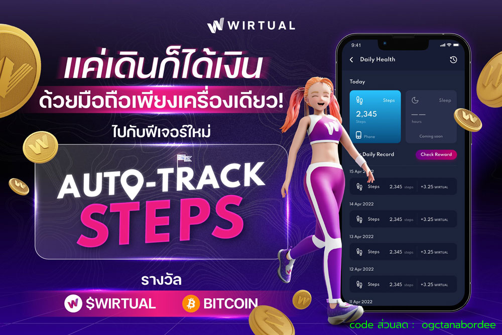 เดินแล้วได้เงิน ด้วยมือถือแค่เครื่องเดียว ไปกับฟีเจอร์ Auto-track Steps ได้ทั้งเหรียญ Bitcoin และ WIRTUAL เริ่มใช้งานได้แล้ววันนี้!