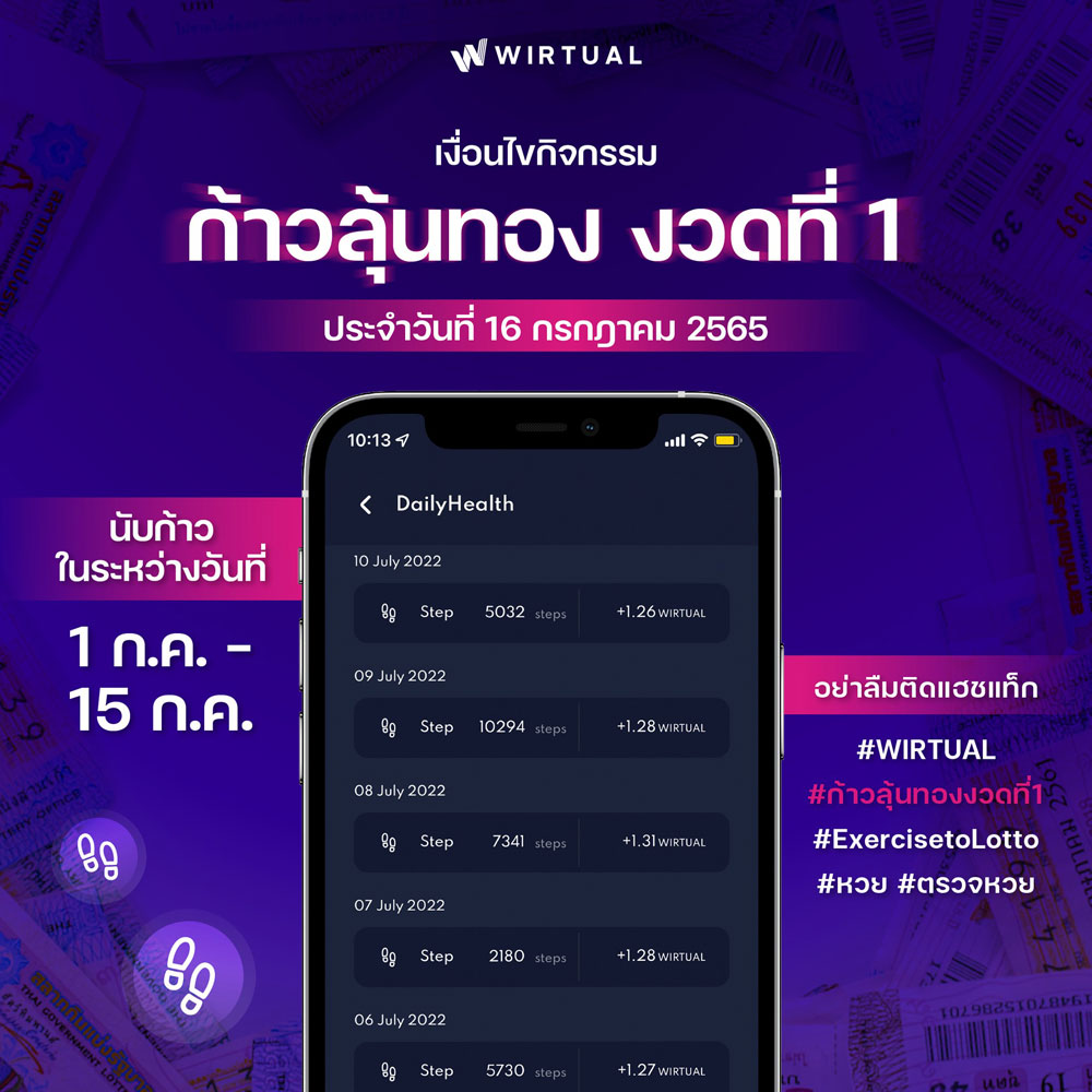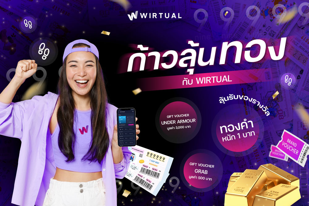ลุ้นหวยกันแบบสองต่อในกิจกรรม "ก้าวลุ้นทอง" กับ WIRTUAL ที่แค่คุณเดินก็มีสิทธิ์ลุ้นทองคำหนัก 1 บาท เพียงนับก้าวเดินในชีวิตประจำวันด้วยแอปฯ WIRTUAL ช่วงระหว่างงวดลอตเตอรี่ประจำงวดนั้น ยิ่งเดินทุกวัน ยิ่งมีโอกาสได้รับของรางวัลจากเราไปเลย!