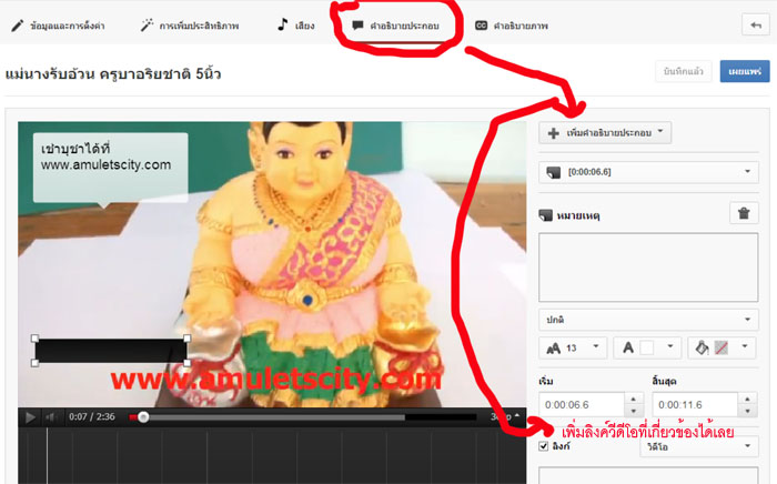 ขอบคุณที่แนะนำวิธีครับ ว่าแต่เดี๋ยวนี้ youtube เค้าก็มีฟังก์ชั่นนี้มาให้แล้วนะครับ มีให้ลิงค์ไปเยอะด้วยแหละ ทั้งวีดีโอ เพลยืลิสต์ google + ลองดูนะครับ ไปที่จัดการวีดีโอ / คำอธิบายประกอบ  ตัวอย่างครับ http://www.youtube.com/watch?v=SJWNzgvVgmUหรือเขียนชื่อเว็บเราใส่เข้าไปเลยยังได้ แต่มันจะลิงค์ไปเว้บได้ไม่ได้นะครับ แต่ก็พลิกแพลงดูได้ หากมีคนสนใจพิมพ์ชื่อเว็บเราดูอีกที http://www.youtube.com/watch?v=0J3S55KVlr0