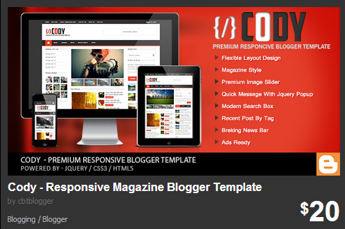 ไปบวชมาหลายเดือนเลยไม่ได้เข้าบอร์ดมานาน ลาสิกขามาเลยเอาของดีมาแบ่งปันครับ กับ Cody Responsive Magazine Blogger Template ค่าตัว 20 เหรียญ จากค่าย ThemeForest ซื้อมาตอนก่อนบวชยังไม่ได้ลองเลยครับกะว่าจะเอาไปทำบล็อกฟุตบอลเอเซียสักหน่อย ผมลองแยกไฟล์แล้วเอามาแบ่งให้ใช้ครับ เท่าที่ผมลองดูไฟล์ที่เอามาแจกก็ใส่ลงบล็อกเกอร์ได้ไม่มีปัญหา ส่วนวิธีการใช้และการปรับแต่งไม่ต้องถามน๊ะครับเพราะผมยังไม่ได้ลองแบบจริงๆ จังๆ แต่รับรองว่าใช้ได้แน่นอน
